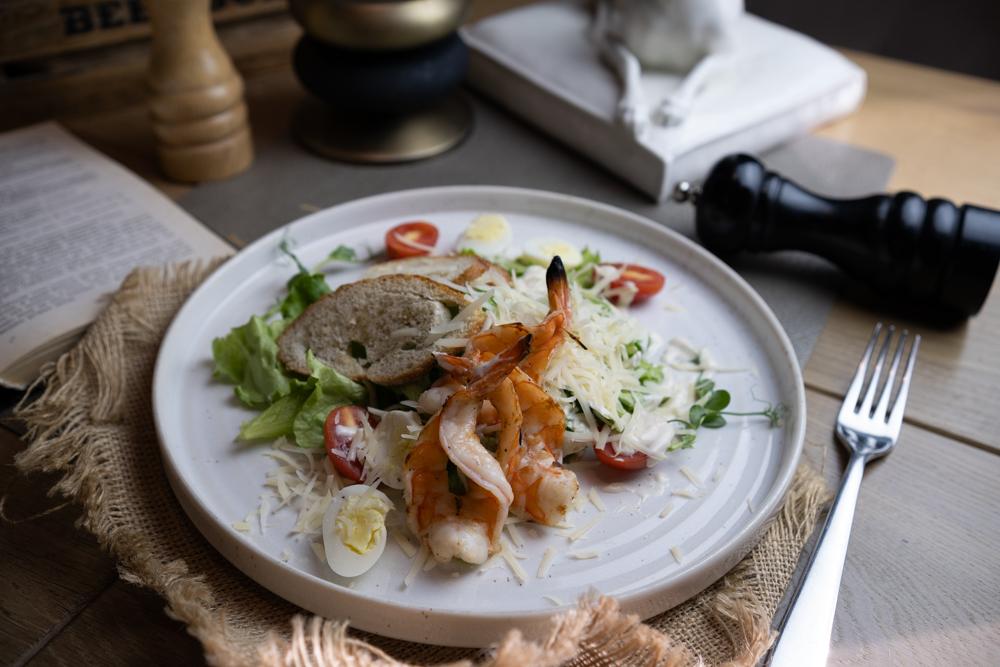 Лист салата, обжаренный корень сельдерея, томаты черри, огурец, взбитое и обжаренное яйцо, отварной говяжий язык, специи.
